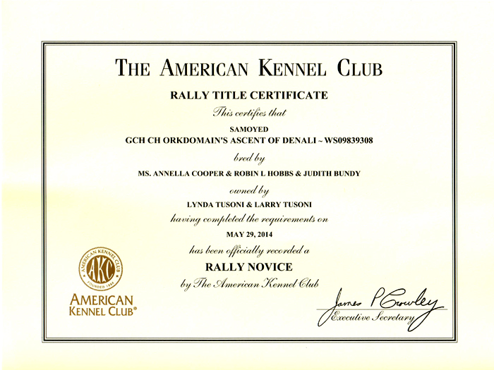Denali finished his Rally Novice title with a score of 94. A BIG thanks to Ann Schlobohm for taking my guy into the ring for that final leg