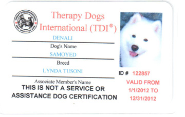 Denali is now certified as a Therapy dog with Therapy Dog International, and can visit assisted living centers,